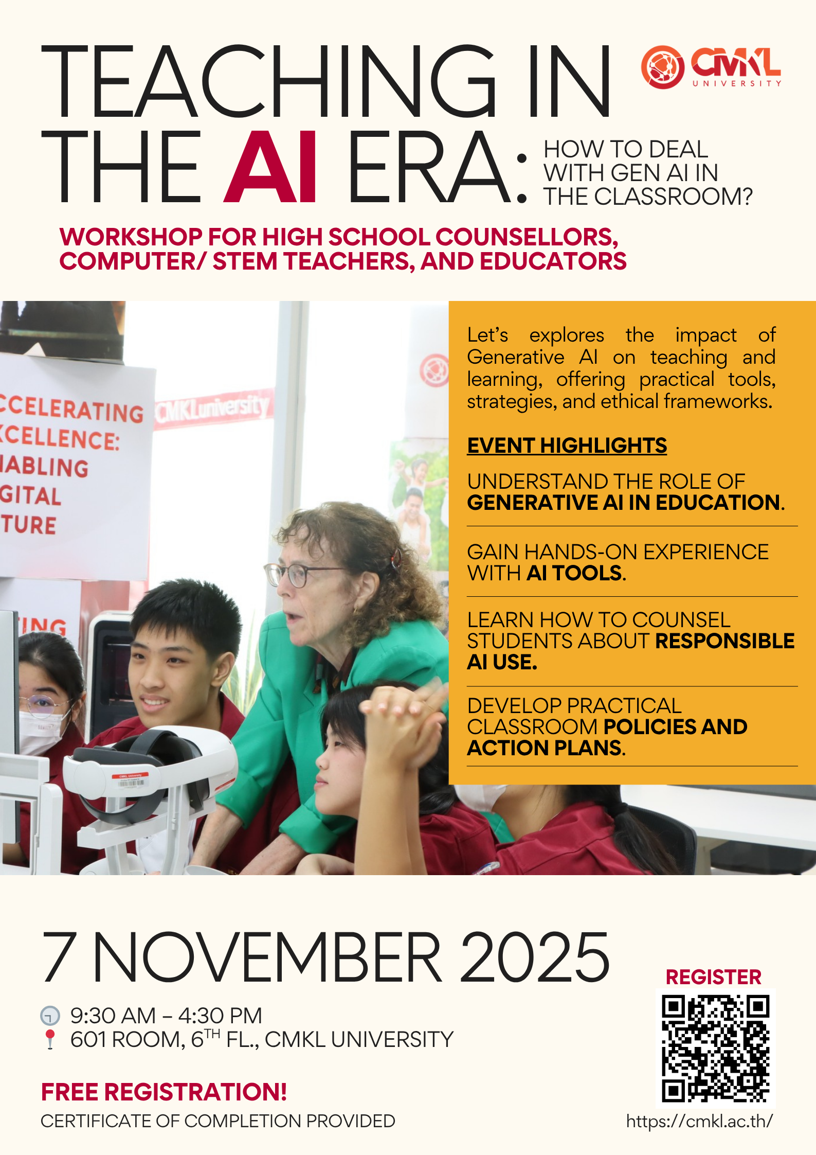 CMKL University is hosting a 1-day workshop designed for high school teacher-counsellors and computer/ICT teachers. Explore the impact of Generative AI on teaching and learning, gain practical tools, and develop strategies for responsible AI integration in the classroom.
