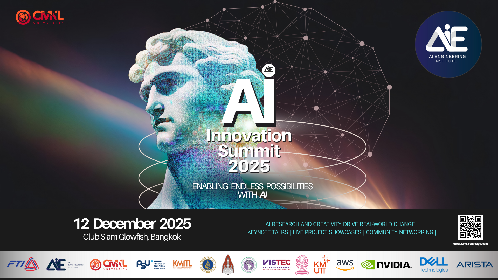 The AI Innovation Summit 2025 is a full-day celebration of how AI empowers humanity and drives real-world transformation. Hosted by CMKL University — Thailand’s first AI-focused university, the summit unites global leaders, experts, and innovators under the theme “Enabling Endless Possibilities with AI.”Morning sessions feature keynotes and panels on human-centric innovation and Thailand’s AI future, while the afternoon highlights live showcases and innovation talks across six domains — from Health and Security to Sustainability, Cloud, Creativity, and Education — advancing the global dialogue on how AI can empower people, industries, and societies.