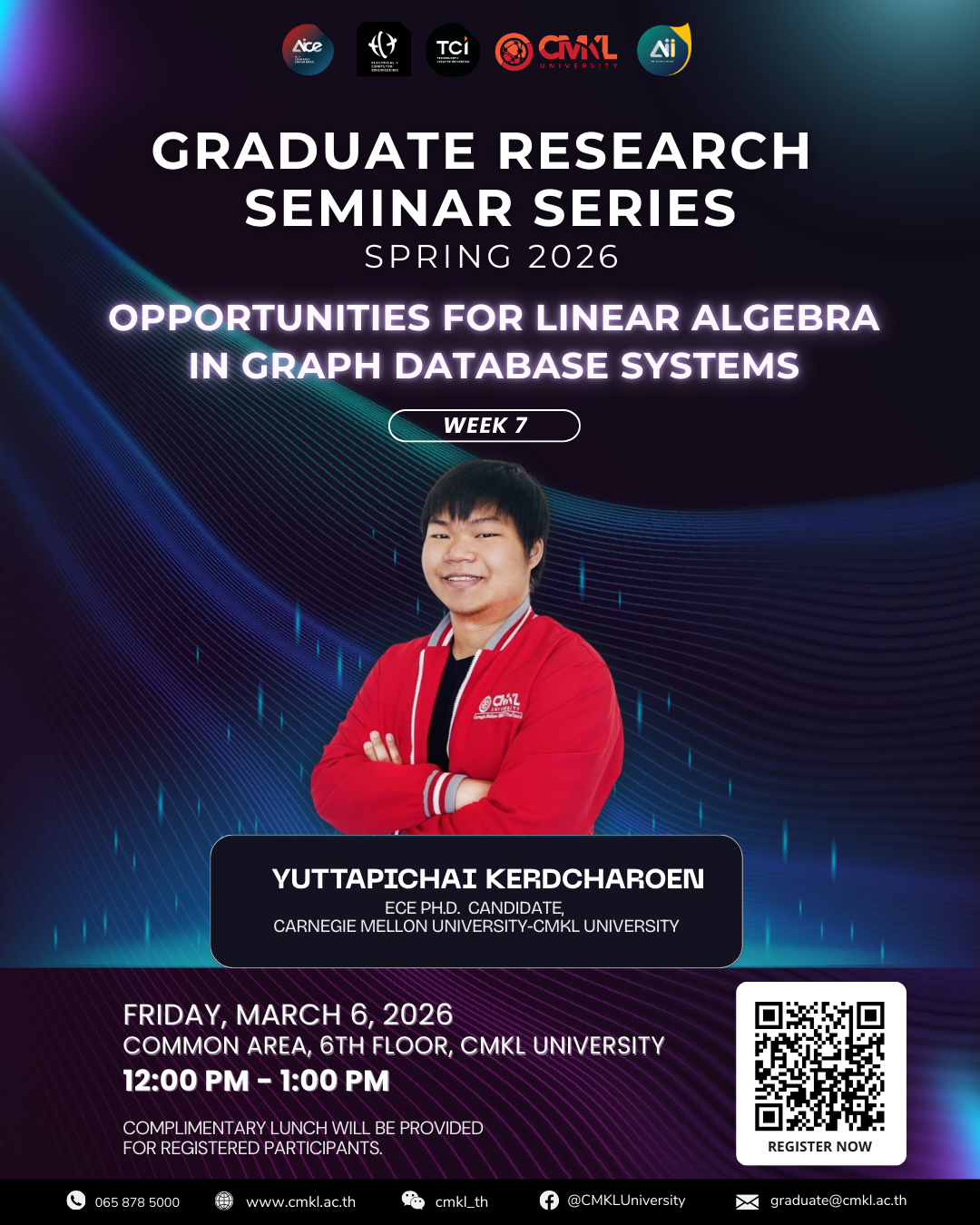This week, we bridge the gap between abstract mathematics and modern data architecture with the topic: “Opportunities for Linear Algebra in Graph Database Systems.” Presented by Yuttapichai Kerdcharoen, an Electrical and Computer Engineering (ECE) Ph.D. candidate at Carnegie Mellon university-CMKL University. This session explores how the power of linear algebra can be harnessed to optimize and revolutionize the way we manage complex graph databases.